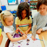 A Modern Face to Ancient Art: To start the Fall lessons we began at the beginning, the Cave Paintings of Lascaux France ( 17,000 years old) and Altamira, Spain (40,000 to 50,000 years old). They are so monumental in the history of Art and an endlessly fascinating subject with so many aspects that are worth investigating. We compared numerous caves throughout the world, that share similar symbols and markings which were the origins of language, alphabets, and communication. Ironically, with all of the developments throughout history that led to printing, books, literature, and education on a mass level, we are now back to communicating by symbols via texts which use some of the same symbols found in the caves. Some of the most interesting aspects of Cave Art are the discoveries of techniques and materials that have lasted throughout thousands of years. The class experimented replicating original materials by mixing pigments from berries and flowers, and painting and drawing with feather quills, plants, and sticks, charcoal, and chalk. Their experiments culminated in the creation of contemporary mixed media monoprints inspired by the early cave artists. It was a multi-layered process that incorporating some of the original symbols and a variety of techniques and materials. This was the first of several lessons about putting a modern face on ancient art as we looked at contemporary artists that have been influenced by the same images and subject matter found in indigenous art. Franz Marc, Picasso, and Leonardo Da Vinci frequently used horses and bulls in their drawings that were very similar to some of the images found in the cave paintings. The enduring legacy of the earliest artists can be seen today in the resurgence of art reflecting the primal and universal images found in nature.