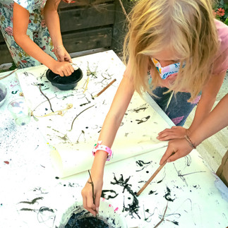 Some of the most interesting aspects of Cave Art are the discoveries of techniques and materials that have lasted throughout thousands of years. The class experimented replicating original materials by mixing pigments from charcoal, berries and flowers, and drawing with plants, sticks, charcoal, and chalk. Their experiments culminated in the creation of contemporary mixed media drawings inspired by the early cave artists. It was a multi-layered process that incorporated some of the original symbol's, chalk, pencil and markers.