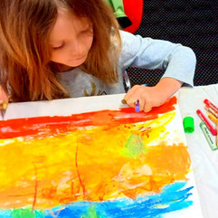 This week the class created vibrant Fauve inspired mixed media paintings. Fall offers such an amazing array of vivid colors which are very close to the heart of the Fauve movement. Fauve artists championed bright colors in their works, especially yellows, reds and oranges. The students had several images to choose from including contemporary to classic artists, to create their mixed media paintings using Fauve artist's signature colors. The first step was the under painting which was done with Kwik Sticks paint sticks in orange, red, yellow and blue. The top layers of textures, highlights and shadows were added with Oil Pastels.