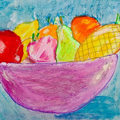 Summer classes are always nature based. The influence of nature in art and design is immeasurable. This week we focused on Summer's bounty of beautiful fruits and all of their shapes and colors. Fruits are featured throughout art history and are beloved subjects for numerous artists. We looked at several styles of art and illustrations of fruit before the students did studies of fruit shapes and translated them into colorful paintings and drawings using acrylics or oil pastels.