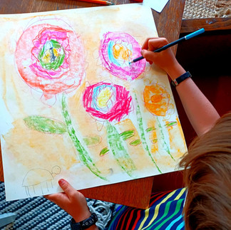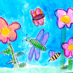 Our lesson this week just happened to coincide with units on insects that several of the students are doing in their classes at school. We looked at a variety of images of insect inspired art and design. They enjoyed the added element of art to what they were learning about the habitats and other aspects of insects. For this lesson they used watercolor pencils and watercolor crayons. They had a variety of insects to select from and could choose their own interpretation and environment to place them in.