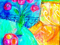 The lessons in the past few weeks were inspired by the art of Renoir and a variety of artists that interpreted the theme, “A Room with a View". Week one, the class either did a landscape or still life inspired by Renoir. Week two we added the window, with the focus on the distant vistas. Last week we incorporated the view from the interior. It was an opportunity to tie all of the elements together layer by layer and design a composition including architecture, furniture, a still life and light and shadow. For the Renoir landscapes we used watercolors and the “Room with a View” pieces were done with oil pastels.